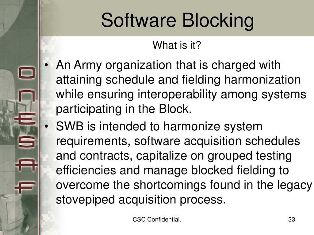 Software Blocking What is it? • An Army organization that is charged with attaining schedule and fielding harmonization while ensuring interoperability among systems participating in the Block. • SWB is intended to harmonize system requirements, software acquisition schedules and contracts, capitalize on grouped testing efficiencies and manage blocked fielding to overcome the shortcomings found in the legacy stovepiped acquisition process. CSC Confidential.