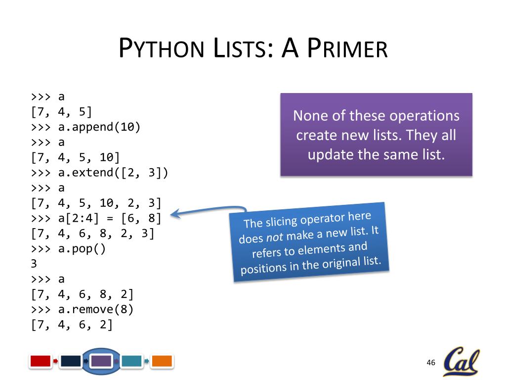 Python Lists: A Primer >>> a [7, 4, 5] >>> a.append(10) >>> a [7, 4, 5, 10] >>> a.extend([2, 3]) >>> a [7, 4, 5, 10, 2, 3] >>> a[2:4] = [6, 8] [7, 4, 6, 8, 2, 3] >>> a.pop() 3 >>> a [7, 4, 6, 8, 2] >>> a.remove(8) [7, 4, 6, 2] None of these operations create new lists. They all update the same list. The slicing operator here does not make a new list. It refers to elements and positions in the original list.