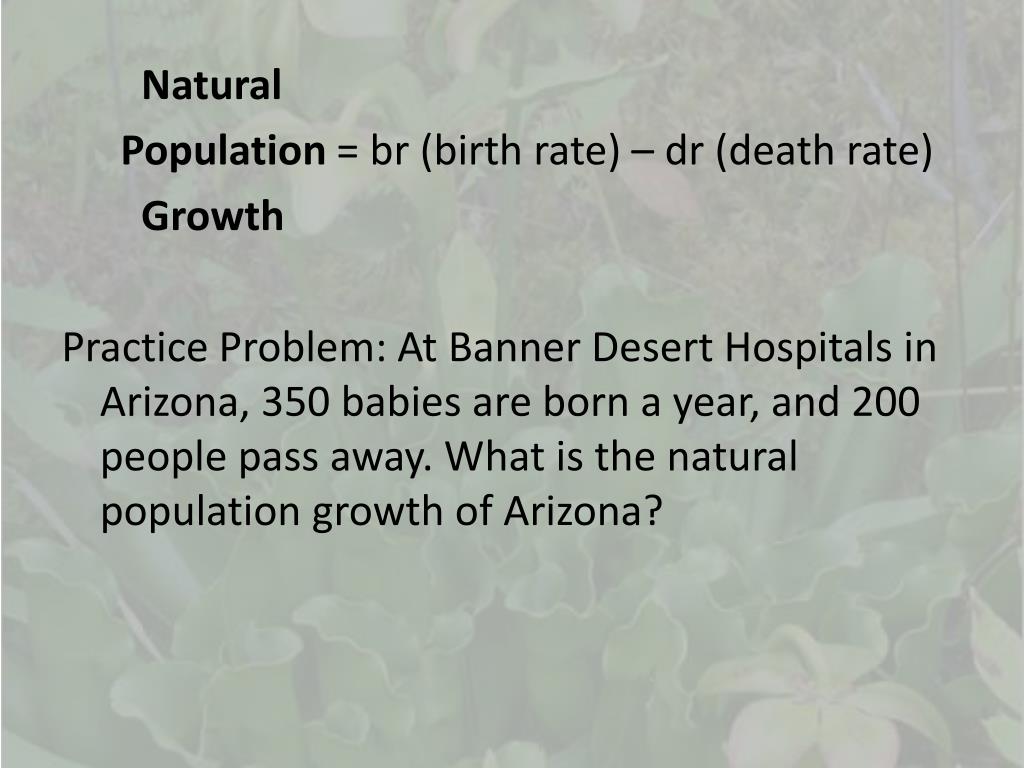 Natural Population = br (birth rate) – dr (death rate) Growth Practice Problem: At Banner Desert Hospitals in Arizona, 350 babies are born a year, and 200 people pass away. What is the natural population growth of Arizona?