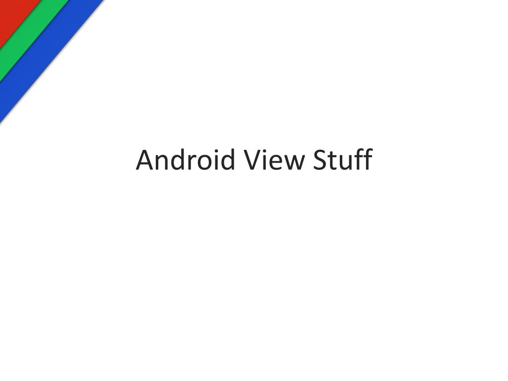 Android View Stuff. TextViews. Display text Display images???. TextView Drawables. TextViews allow drawables to appear to the left of, above, to the right of, and below the text. <? xml version = "1.0" encoding = "utf-8" ?>