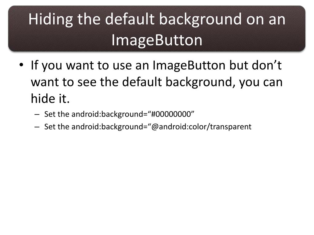 Hiding the default background on an ImageButton • If you want to use an ImageButton but don’t want to see the default background, you can hide it. • Set the android:background=“#00000000” • Set the android:background=“@android:color/transparent