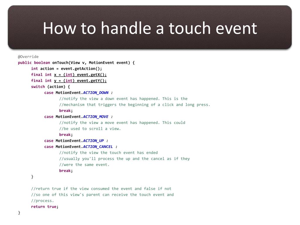 How to handle a touch event @Override publicbooleanonTouch(View v, MotionEvent event) { int action = event.getAction(); finalintx = (int) event.getX(); finalinty = (int) event.getY(); switch (action) { caseMotionEvent.ACTION_DOWN : //notify the view a down event has happened. This is the //mechanism that triggers the beginning of a click and long press. break; caseMotionEvent.ACTION_MOVE : //notify the view a move event has happened. This could //be used to scroll a view. break; caseMotionEvent.ACTION_UP : caseMotionEvent.ACTION_CANCEL : //notify the view the touch event has ended //usually you'll process the up and the cancel as if they //were the same event. break; } //return true if the view consumed the event and false if not //so one of this view's parent can receive the touch event and //process. returntrue; }