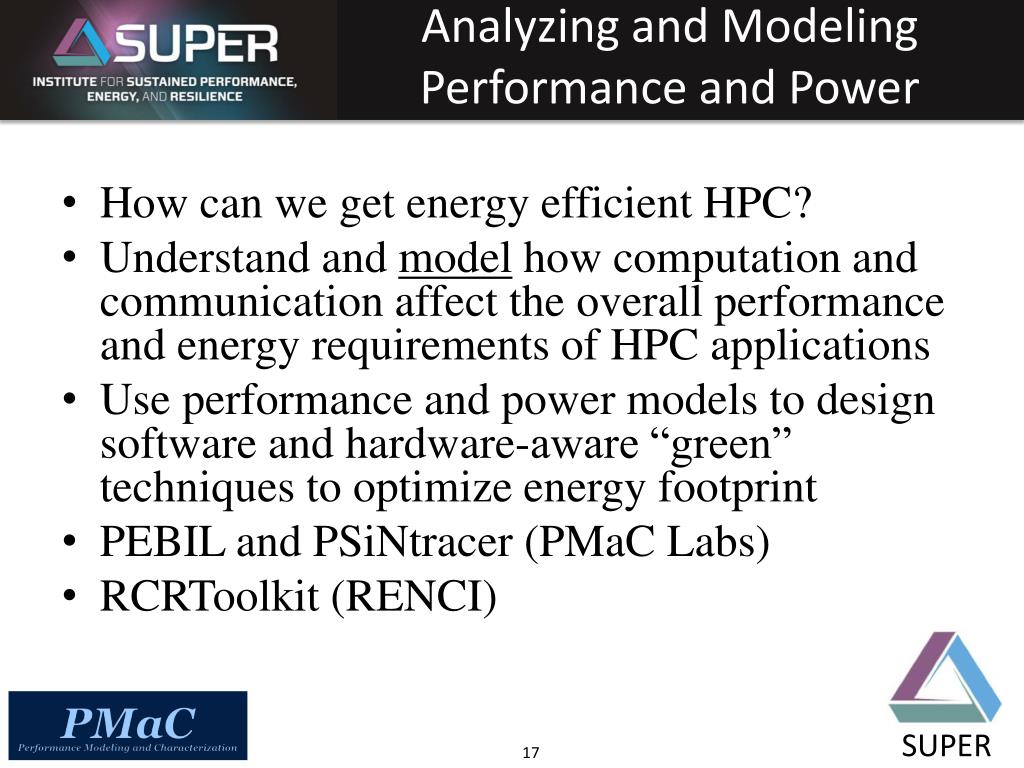Analyzing and Modeling Performance and Power How can we get energy efficient HPC? Understand and model how computation and communication affect the overall performance and energy requirements of HPC applications Use performance and power models to design software and hardware-aware “green” techniques to optimize energy footprint PEBIL and PSiNtracer (PMaC Labs) RCRToolkit (RENCI)