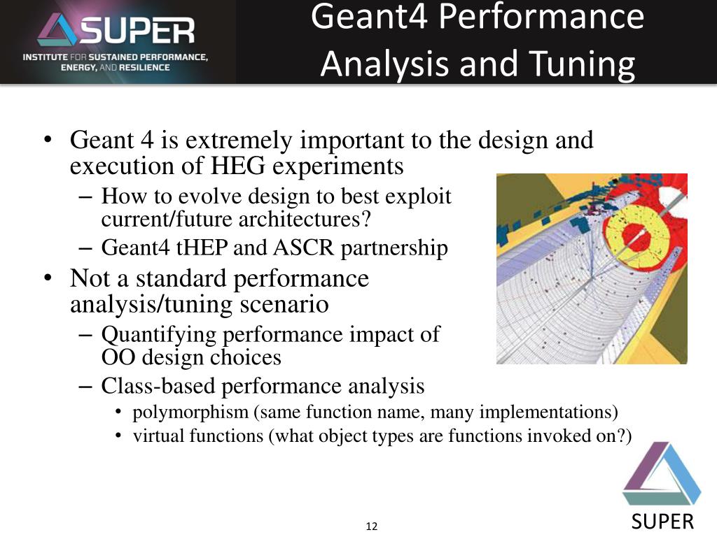 Geant4 Performance Analysis and Tuning • Geant 4 is extremely important to the design and execution of HEG experiments • How to evolve design to best exploitcurrent/future architectures? • Geant4 tHEPand ASCR partnership • Not a standard performanceanalysis/tuning scenario • Quantifying performance impact ofOO design choices • Class-based performance analysis • polymorphism (same function name, many implementations) • virtual functions (what object types are functions invoked on?)