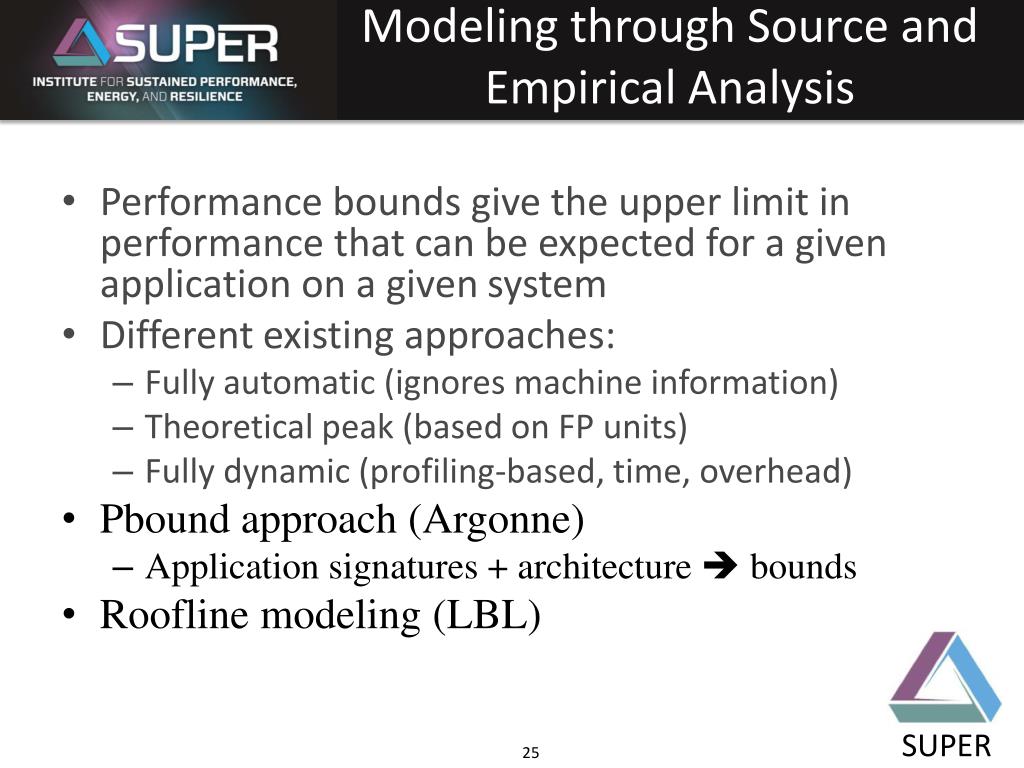Modeling through Source and Empirical Analysis • Performance bounds give the upper limit in performance that can be expected for a given application on a given system • Different existing approaches: • Fully automatic (ignores machine information) • Theoretical peak (based on FP units) • Fully dynamic (profiling-based, time, overhead) • Pboundapproach (Argonne) • Application signatures + architecture bounds • Roofline modeling (LBL)