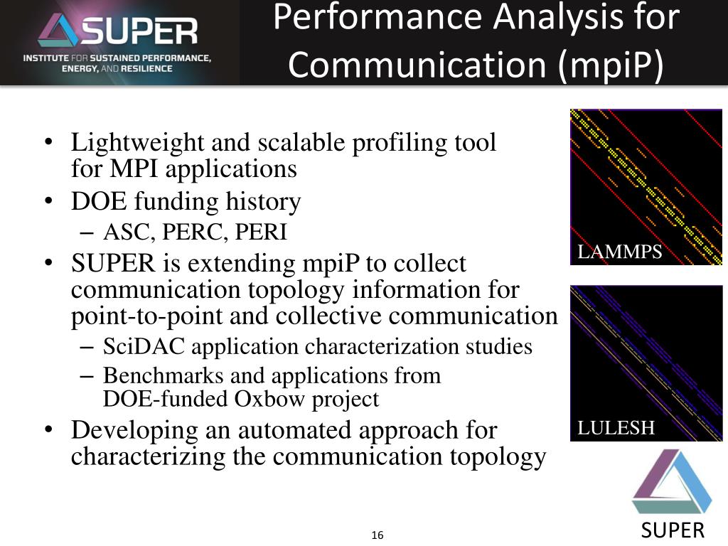 Performance Analysis for Communication (mpiP) LAMMPS LULESH • Lightweight and scalable profiling toolfor MPI applications • DOE funding history • ASC, PERC, PERI • SUPER is extending mpiP to collectcommunication topology information forpoint-to-point and collective communication • SciDAC application characterization studies • Benchmarks and applications fromDOE-funded Oxbow project • Developing an automated approach forcharacterizing the communication topology