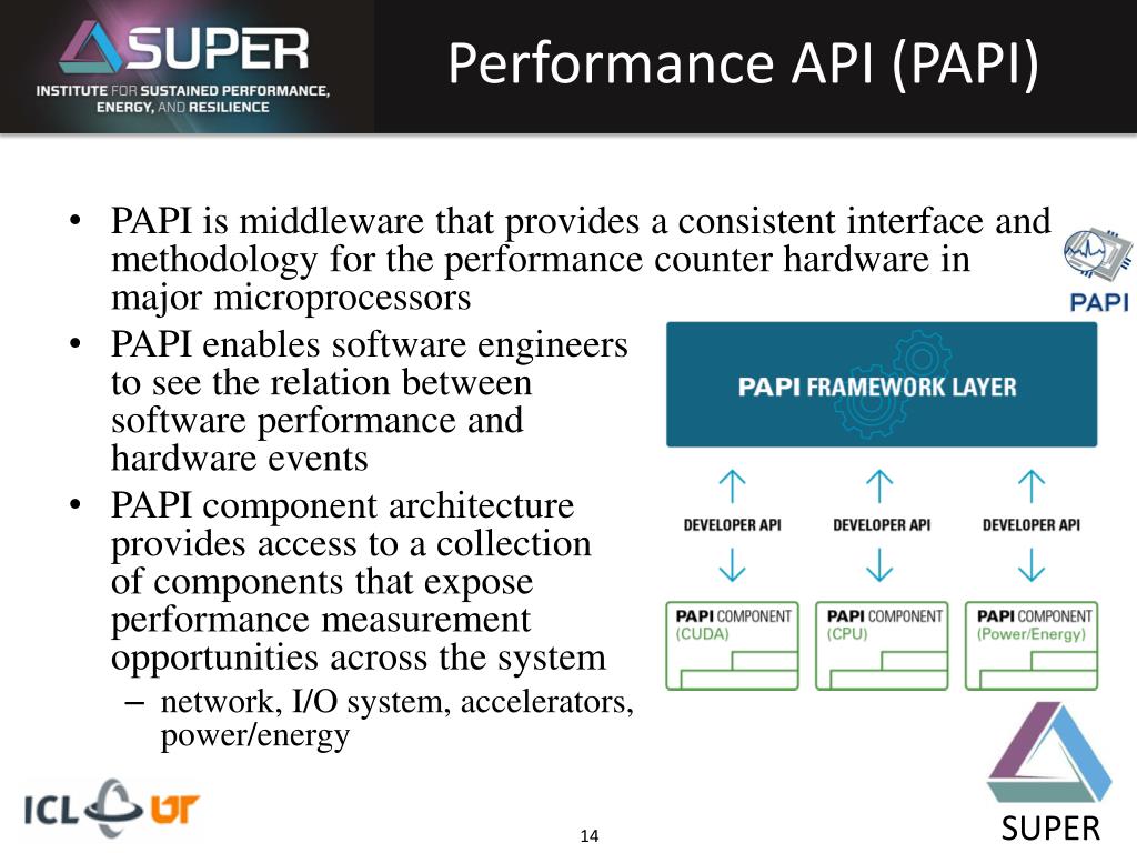 PAPI Pipeline PaRSEC (UTK) TAU (UO) PerfSuite (NCSA)HPCToolkit (Rice) SCALASCA (FZJ, UTK)VampirVampir (TUD) Open|Speedshop (LLNL)SvPablo (RENCI) • DOE support • ASCR (2002-05) • PERC (2001-06) • PERI (2006-11) • PAPI is widelyavailable onprocessors and isheavily used inSUPER across areas