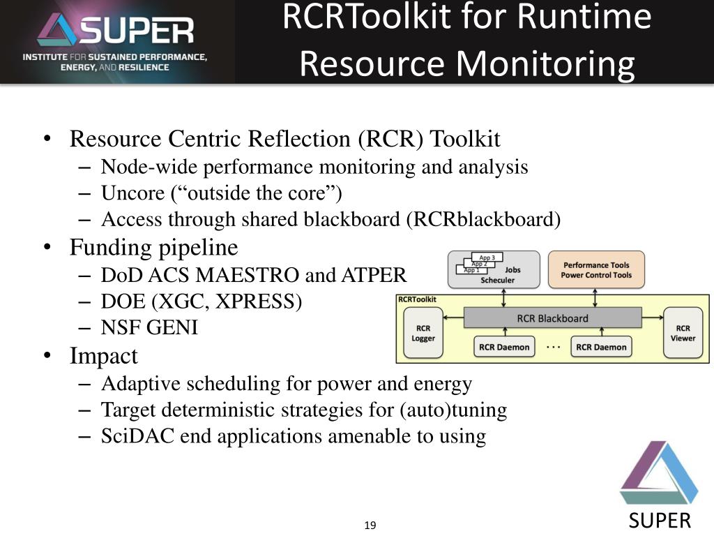 RCRToolkit for Runtime Resource Monitoring • Resource Centric Reflection (RCR) Toolkit • Node-wide performance monitoring and analysis • Uncore (“outside the core”) • Access through shared blackboard (RCRblackboard) • Funding pipeline • DoD ACS MAESTRO and ATPER • DOE (XGC, XPRESS) • NSF GENI • Impact • Adaptive scheduling for power and energy • Target deterministic strategies for (auto)tuning • SciDACend applications amenable to using