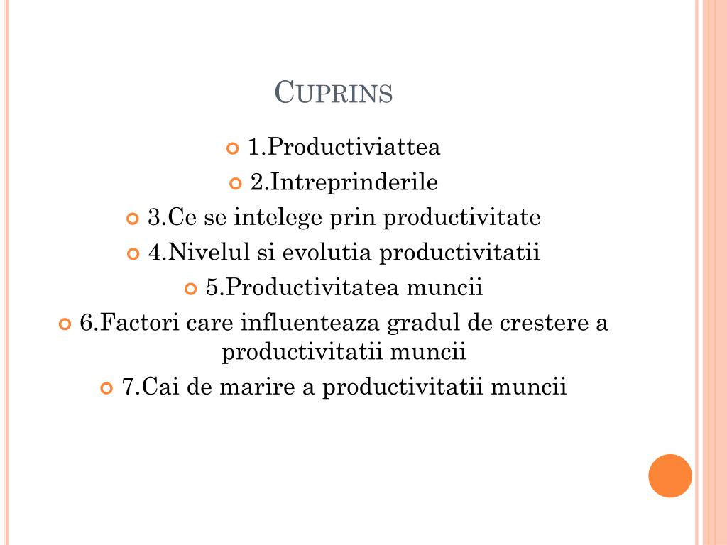 Cuprins • 1.Productiviattea • 2.Intreprinderile • 3.Ce se intelegeprinproductivitate • 4.Nivelul sievolutiaproductivitatii • 5.Productivitatea muncii • 6.Factori care influenteazagradul de crestere a productivitatiimuncii • 7.Cai de marire a productivitatiimuncii