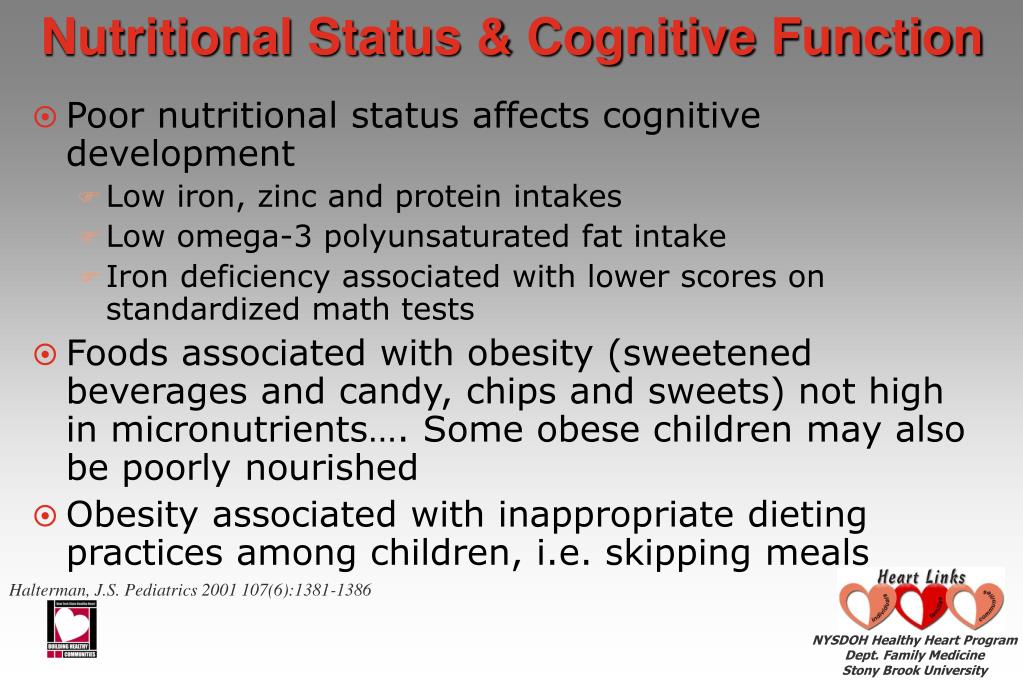 Nutritional Status & Cognitive Function • Poor nutritional status affects cognitive development • Low iron, zinc and protein intakes • Low omega-3 polyunsaturated fat intake • Iron deficiency associated with lower scores on standardized math tests • Foods associated with obesity (sweetened beverages and candy, chips and sweets) not high in micronutrients…. Some obese children may also be poorly nourished • Obesity associated with inappropriate dieting practices among children, i.e. skipping meals Halterman, J.S. Pediatrics 2001 107(6):1381-1386