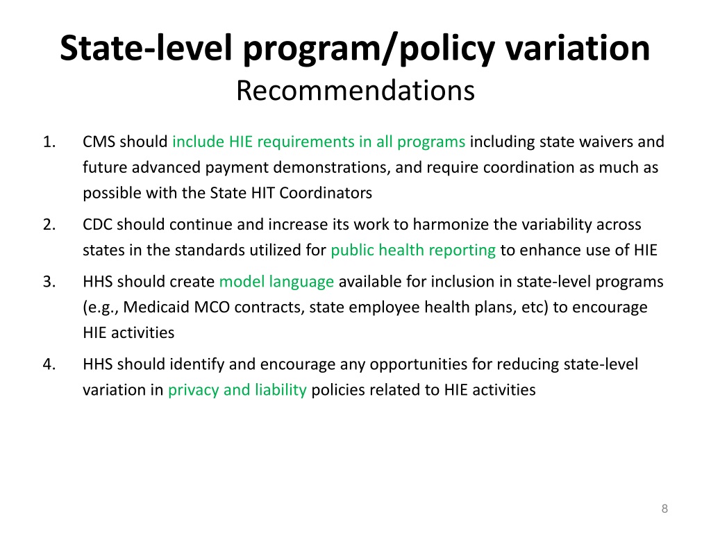 State-level program/policy variationRecommendations • CMS should include HIE requirements in all programs including state waivers and future advanced payment demonstrations, and require coordination as much as possible with the State HIT Coordinators • CDC should continue and increase its work to harmonize the variability across states in the standards utilized for public health reporting to enhance use of HIE • HHS should create model language available for inclusion in state-level programs (e.g., Medicaid MCO contracts, state employee health plans, etc) to encourage HIE activities • HHS should identify and encourage any opportunities for reducing state-level variation in privacy and liability policies related to HIE activities