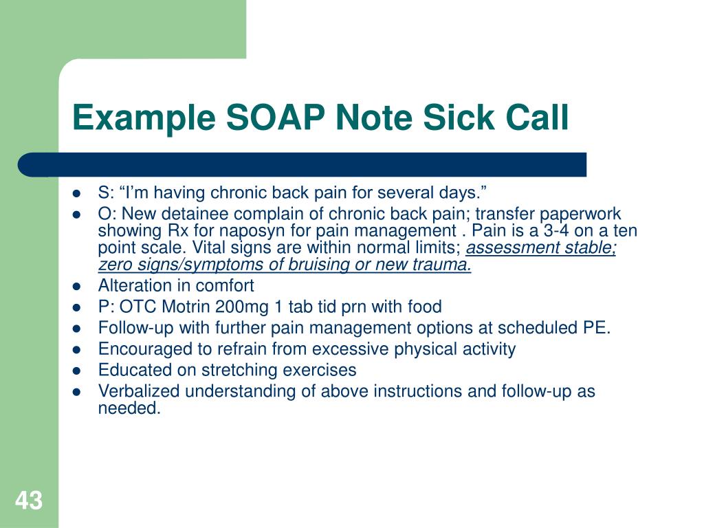 Example SOAP Note Sick Call • S: “I’m having chronic back pain for several days.” • O: New detainee complain of chronic back pain; transfer paperwork showing Rx for naposyn for pain management . Pain is a 3-4 on a ten point scale. Vital signs are within normal limits; assessment stable; zero signs/symptoms of bruising or new trauma. • Alteration in comfort • P: OTC Motrin 200mg 1 tab tid prn with food • Follow-up with further pain management options at scheduled PE. • Encouraged to refrain from excessive physical activity • Educated on stretching exercises • Verbalized understanding of above instructions and follow-up as needed.