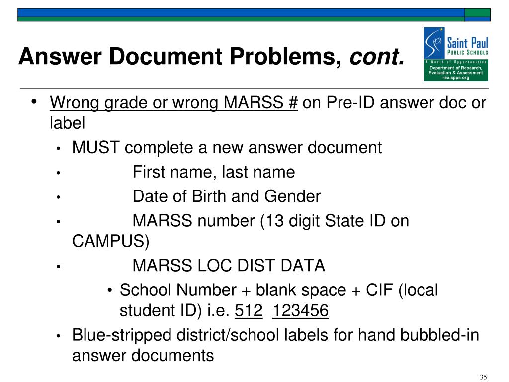 Answer Document Problems,cont. • Wrong grade or wrong MARSS # on Pre-ID answer doc or label • MUST complete a new answer document • First name, last name • Date of Birth and Gender • MARSS number (13 digit State ID on CAMPUS) • MARSS LOC DIST DATA • School Number + blank space + CIF (local student ID) i.e. 512123456 • Blue-stripped district/school labels for hand bubbled-in answer documents