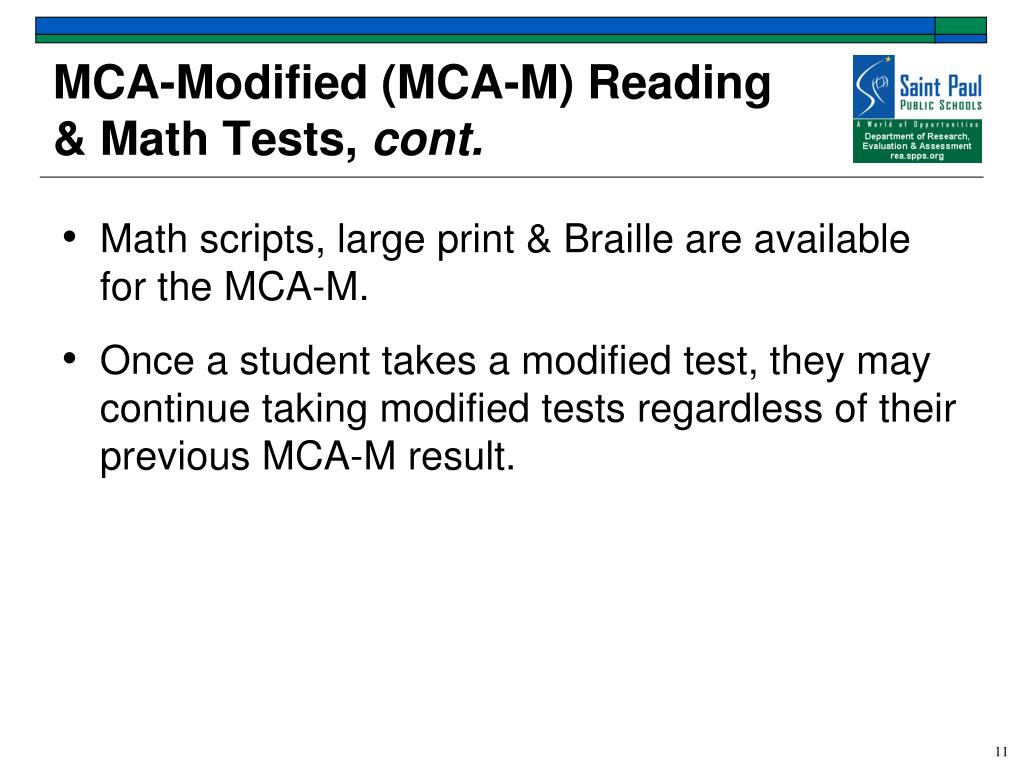 MCA-Modified (MCA-M) Reading& Math Tests, cont. • Math scripts, large print & Braille are available for the MCA-M. • Once a student takes a modified test, they may continue taking modified tests regardless of their previous MCA-M result.