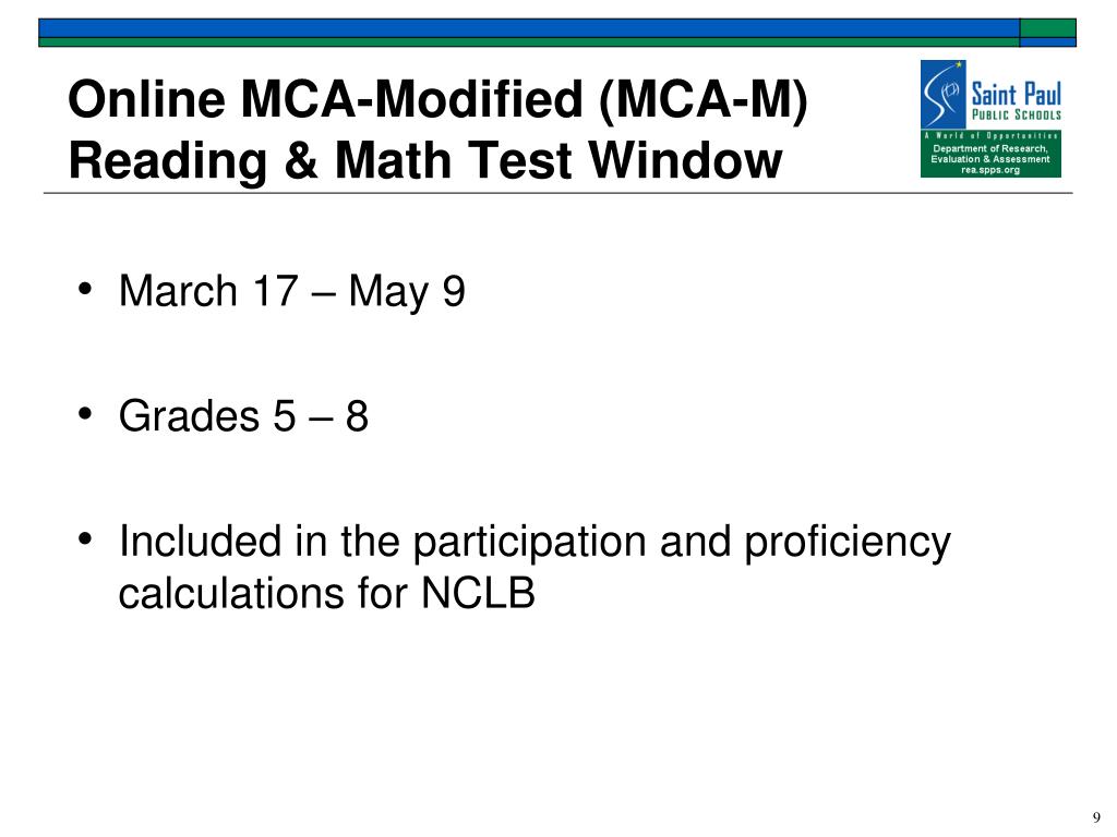 Online MCA-Modified (MCA-M)Reading & Math Test Window • March 17 – May 9 • Grades 5 – 8 • Included in the participation and proficiency calculations for NCLB