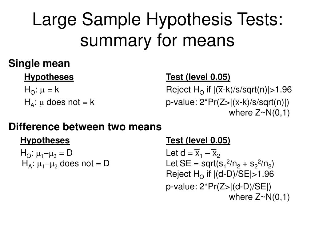 Large Sample Hypothesis Tests: summary for means Single mean HypothesesTest (level 0.05) HO: m = k Reject HO if |(x-k)/s/sqrt(n)|>1.96 HA: m does not = k p-value: 2*Pr(Z>|(x-k)/s/sqrt(n)|) where Z~N(0,1) Difference between two means HypothesesTest (level 0.05) HO: m1-m2 = D Let d = x1 – x2HA: m1-m2 does not = DLetSE = sqrt(s12/n2 + s22/n2) Reject HO if |(d-D)/SE|>1.96 p-value: 2*Pr(Z>|(d-D)/SE|) where Z~N(0,1)