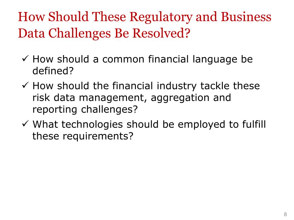 How Should These Regulatory and Business Data Challenges Be Resolved? • How should a common financial language be defined? • How should the financial industry tackle these risk data management, aggregation and reporting challenges? • What technologies should be employed to fulfill these requirements?