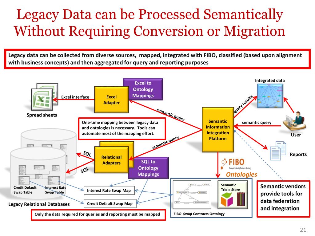 Legacy Data can be Processed Semantically Without Requiring Conversion or Migration Legacy data can be collected from diverse sources, mapped, integrated with FIBO, classified (based upon alignment with business concepts) and then aggregated for query and reporting purposes Integrated data Excel to Ontology Mappings Excel Adapter Excel interface query results Semantic Information Integration Platform Spread sheets semantic query One-time mapping between legacy data and ontologies is necessary. Tools can automate most of the mapping effort. semantic query semantic query Relational Adapter Relational Adapters SQL Reports SQL to Ontology Mappings SQL Semantic Triple Store Semantic vendors provide tools for data federation and integration Credit Default Swap Table Interest Rate Swap Table User Interest Rate Swap Map Legacy Relational Databases Credit Default Swap Map Only the data required for queries and reporting must be mapped FIBO Swap Contracts Ontology Ontologies