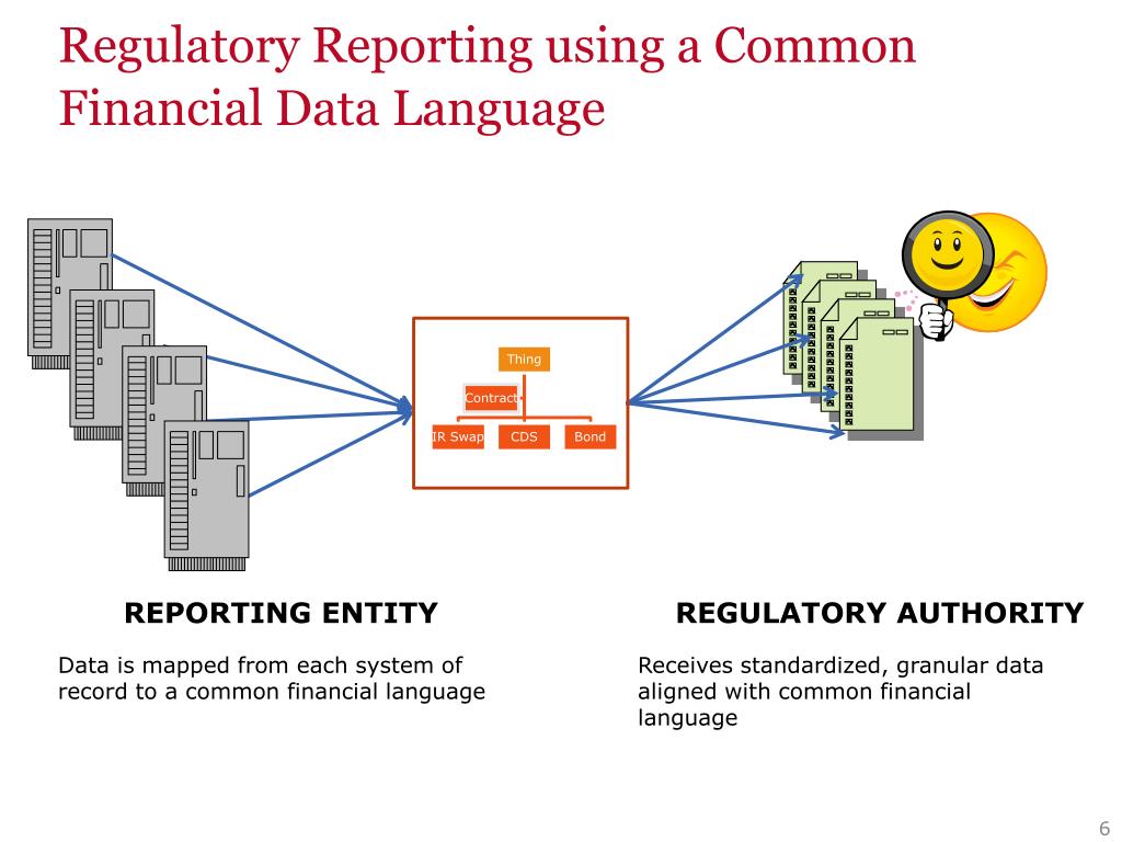 Regulatory Reporting using a Common Financial Data Language REPORTING ENTITY REGULATORY AUTHORITY Data is mapped from each system of record to a common financial language Receives standardized, granular data aligned with common financial language