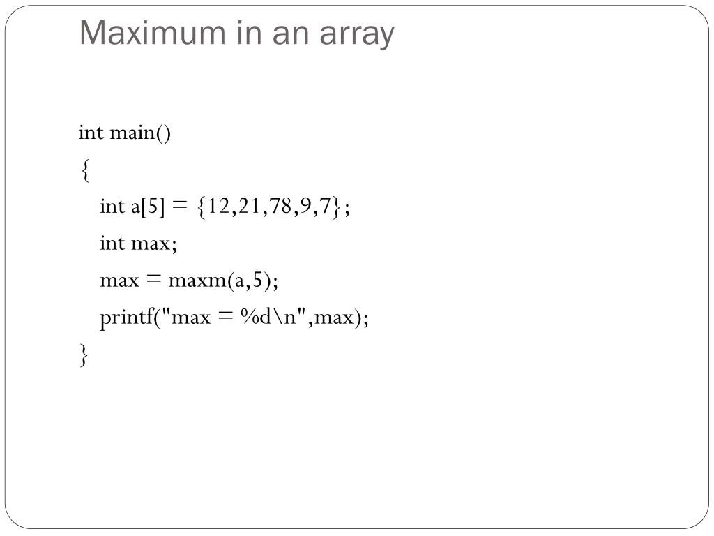 Maximum in an array int main() { int a[5] = {12,21,78,9,7}; int max; max = maxm(a,5); printf("max = %d\n",max); }