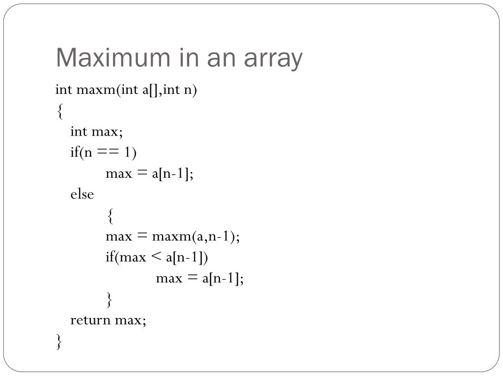 Maximum in an array intmaxm(int a[],int n) { int max; if(n == 1) max = a[n-1]; else { max = maxm(a,n-1); if(max < a[n-1]) max = a[n-1]; } return max; }