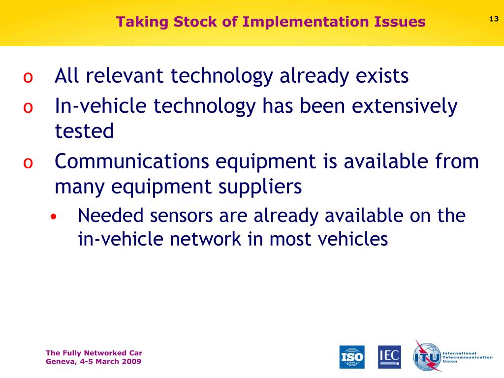 Taking Stock of Implementation Issues • All relevant technology already exists • In-vehicle technology has been extensively tested • Communications equipment is available from many equipment suppliers • Needed sensors are already available on the in-vehicle network in most vehicles