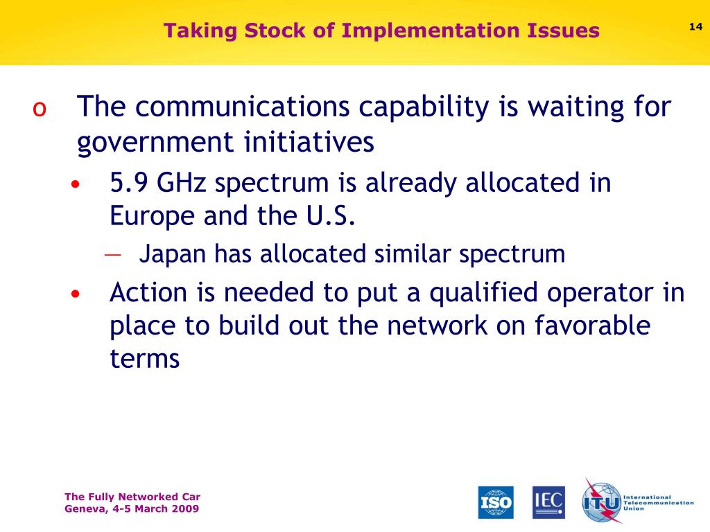 Taking Stock of Implementation Issues • The communications capability is waiting for government initiatives • 5.9 GHz spectrum is already allocated in Europe and the U.S. • Japan has allocated similar spectrum • Action is needed to put a qualified operator in place to build out the network on favorable terms