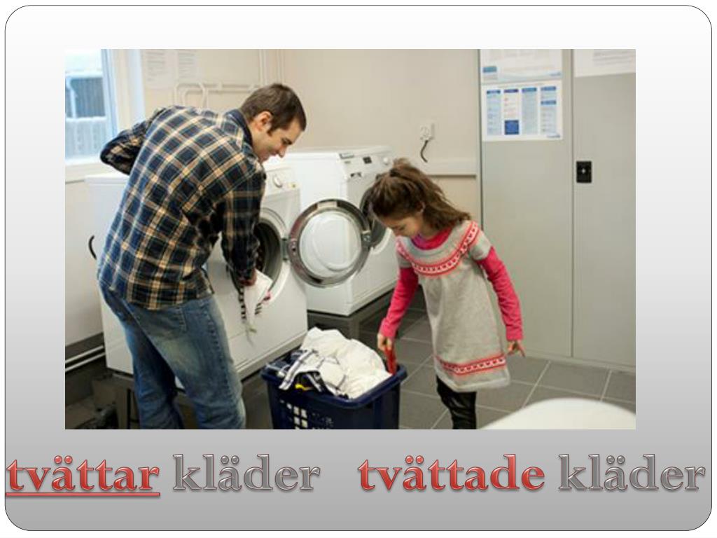 Verb. Vad gör de?. Vad gjorde de?. lagar mat . lagade mat. städade. städar. handlar mat. handlade mat. tittar på teve. tittade på teve. sover. sov. köpte kläder. köper kläder. tvättade kläder. tvättar kläder. åkte tåg eller åkte buss. åker tåg eller åker buss.