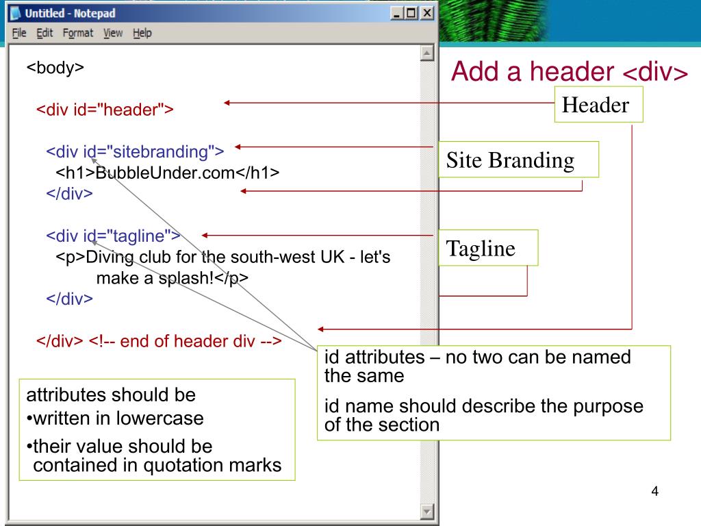 Add a header <div> <body> <div id="header"> <div id="sitebranding"> <h1>BubbleUnder.com</h1> </div> <div id="tagline"> <p>Diving club for the south-west UK - let's make a splash!</p> </div> </div> <!-- end of header div --> <ul> <li>Home</li> <li>About Us</li> <li>Contact Us</li> </ul> Header Site Branding Tagline id attributes – no two can be named the same id name should describe the purpose of the section • attributes should be • written in lowercase • their value should be contained in quotation marks