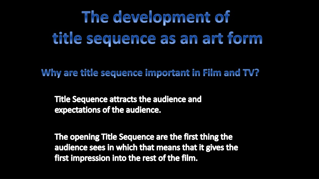 The development of title sequence as an art form Why are title sequence important in Film and TV? Title Sequence attracts the audience and expectations of the audience. The opening Title Sequence are the first thing the audience sees in which that means that it gives the first impression into the rest of the film.