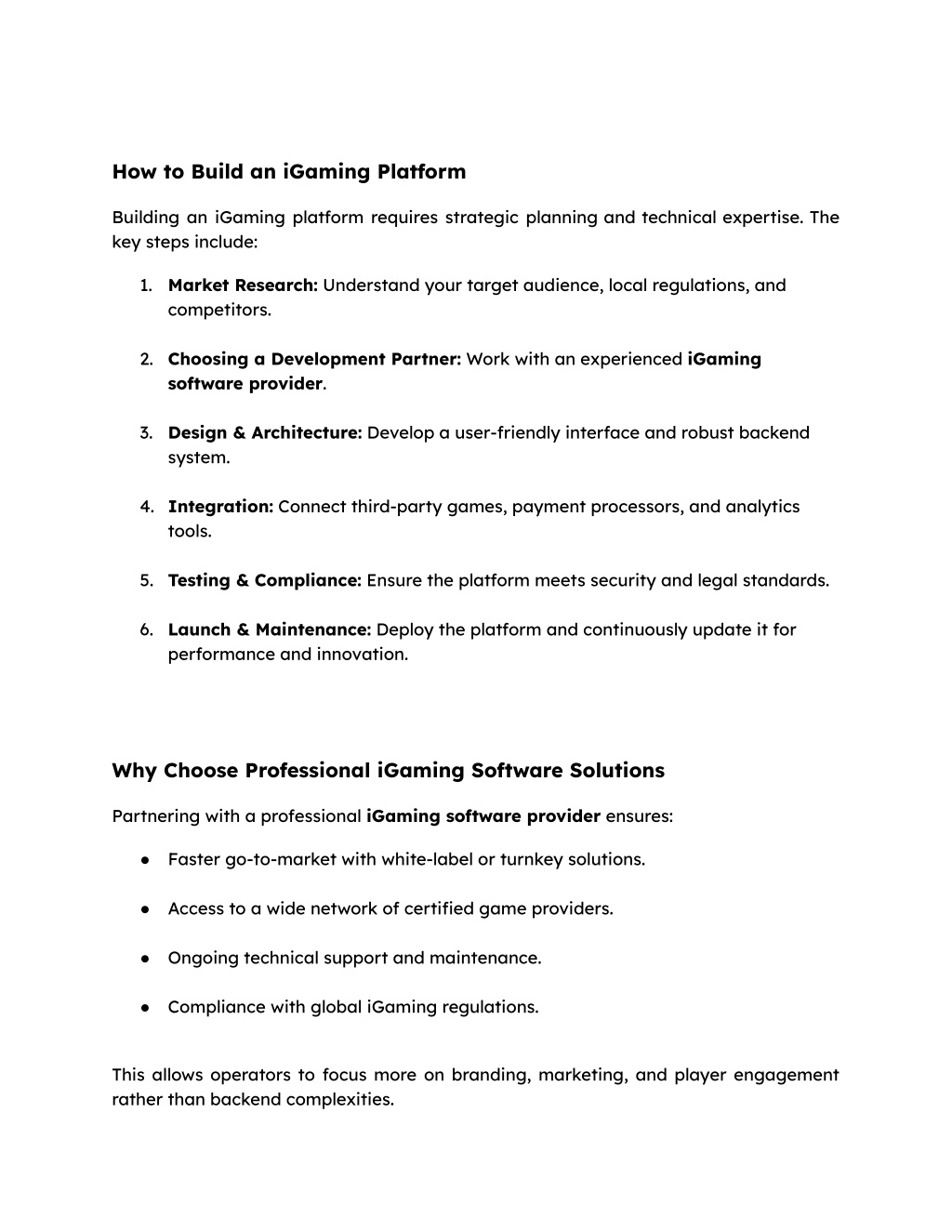 3. How to Build an iGaming Platform Building an iGaming platform requires strategic planning and technical expertise. The key steps include: 1. Market Research: Understand your target audience, local regulations, and competitors. 2. Choosing a Development Partner: Work with an experienced iGaming software provider. 3. Design & Architecture: Develop a user-friendly interface and robust backend system. 4. Integration: Connect third-party games, payment processors, and analytics tools. 5. Testing & Compliance: Ensure the platform meets security and legal standards. 6. Launch & Maintenance: Deploy the platform and continuously update it for performance and innovation. Why Choose Professional iGaming Software Solutions Partnering with a professional iGaming software provider ensures: ● Faster go-to-market with white-label or turnkey solutions. ● Access to a wide network of certified game providers. ● Ongoing technical support and maintenance. ● Compliance with global iGaming regulations. This allows operators to focus more on branding, marketing, and player engagement rather than backend complexities.