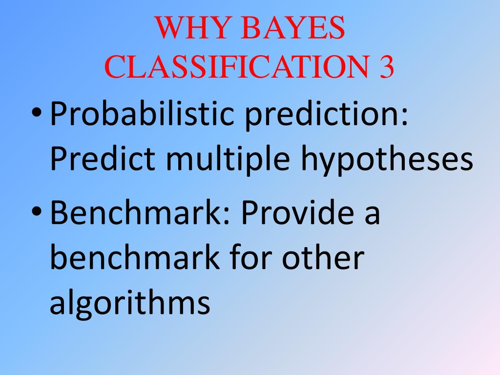 WHY BAYES CLASSIFICATION 3 • Probabilistic prediction: Predict multiple hypotheses • Benchmark: Provide a benchmark for other algorithms
