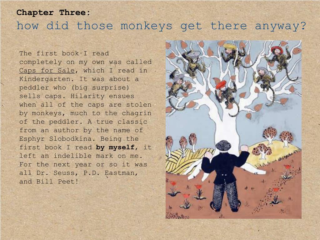 Chapter Three:how did those monkeys get there anyway? The first book I read completely on my own was called Caps for Sale, which I read in Kindergarten. It was about a peddler who (big surprise) sells caps. Hilarity ensues when all of the caps are stolen by monkeys, much to the chagrin of the peddler. A true classic from an author by the name of Esphyr Slobodkina. Being the first book I read by myself, it left an indelible mark on me. For the next year or so it was all Dr. Seuss, P.D. Eastman, and Bill Peet!