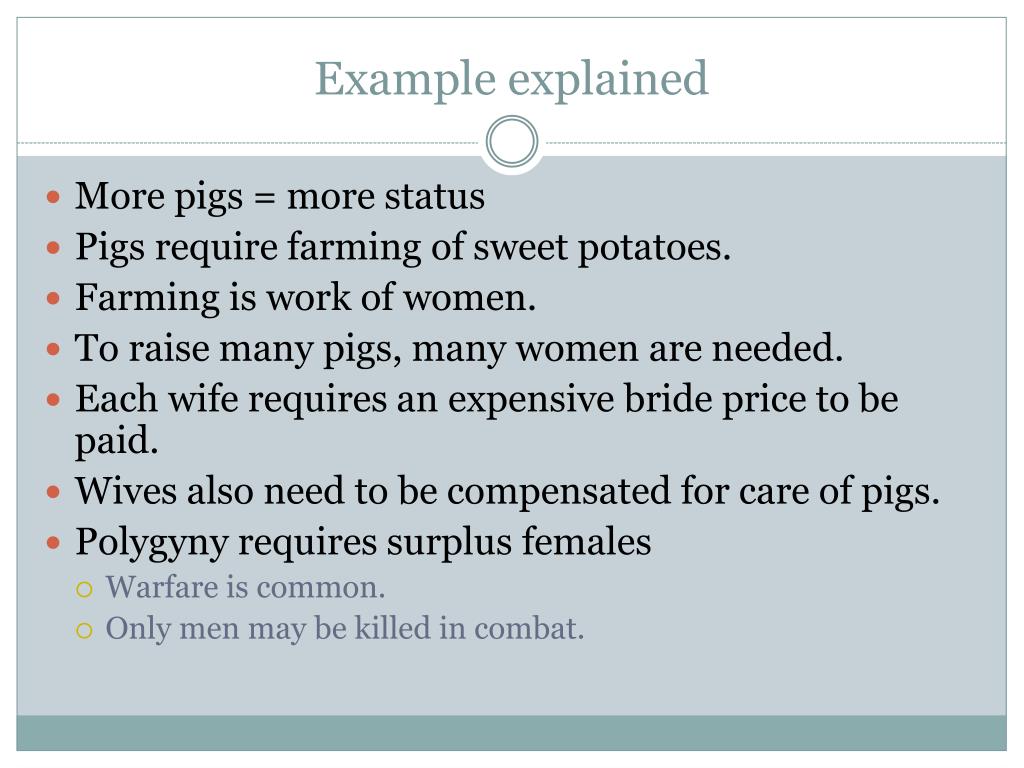 Example explained • More pigs = more status • Pigs require farming of sweet potatoes. • Farming is work of women. • To raise many pigs, many women are needed. • Each wife requires an expensive bride price to be paid. • Wives also need to be compensated for care of pigs. • Polygyny requires surplus females • Warfare is common. • Only men may be killed in combat.