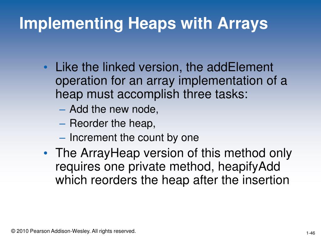 Implementing Heaps with Arrays • Like the linked version, the addElement operation for an array implementation of a heap must accomplish three tasks: • Add the new node, • Reorder the heap, • Increment the count by one • The ArrayHeap version of this method only requires one private method, heapifyAdd which reorders the heap after the insertion