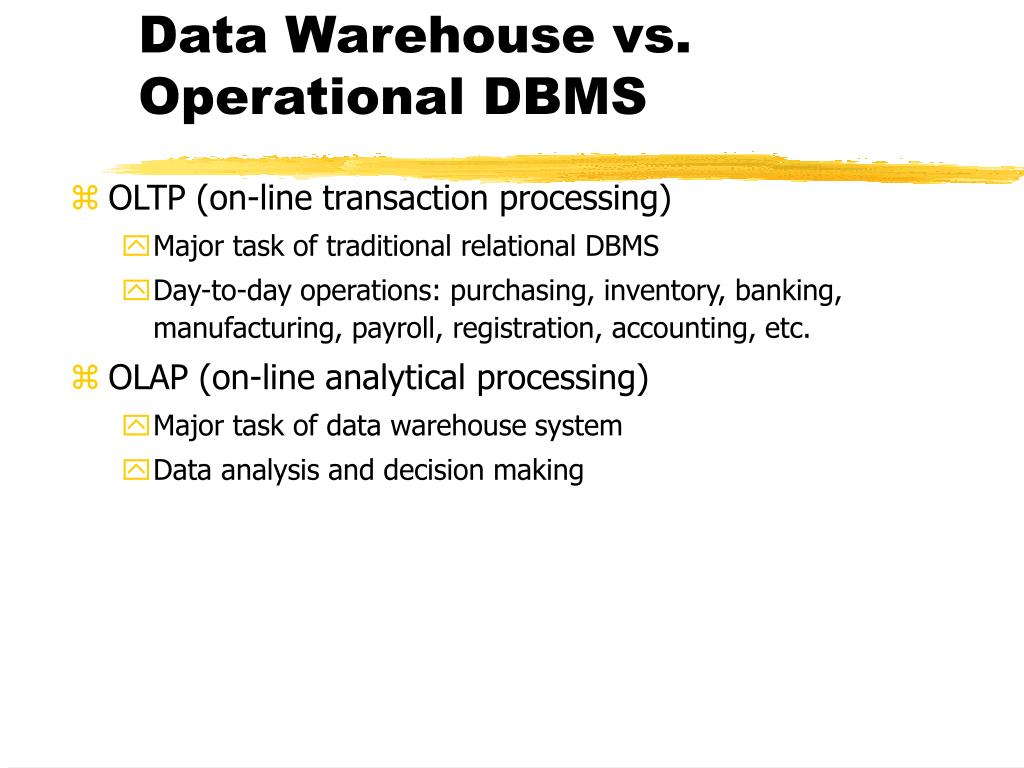 Data Warehouse vs. Operational DBMS • OLTP (on-line transaction processing) • Major task of traditional relational DBMS • Day-to-day operations: purchasing, inventory, banking, manufacturing, payroll, registration, accounting, etc. • OLAP (on-line analytical processing) • Major task of data warehouse system • Data analysis and decision making