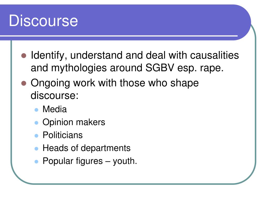 Discourse • Identify, understand and deal with causalities and mythologies around SGBV esp. rape. • Ongoing work with those who shape discourse: • Media • Opinion makers • Politicians • Heads of departments • Popular figures – youth.