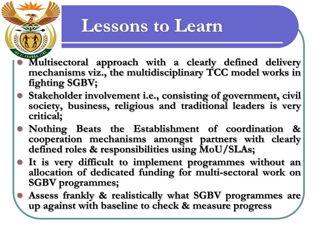 Lessons to Learn • Multisectoral approach with a clearly defined delivery mechanisms viz., the multidisciplinary TCC model works in fighting SGBV; • Stakeholder involvement i.e., consisting of government, civil society, business, religious and traditional leaders is very critical; • Nothing Beats the Establishment of coordination & cooperation mechanisms amongst partners with clearly defined roles & responsibilities using MoU/SLAs; • It is very difficult to implement programmes without an allocation of dedicated funding for multi-sectoral work on SGBV programmes; • Assess frankly & realistically what SGBV programmes are up against with baseline to check & measure progress