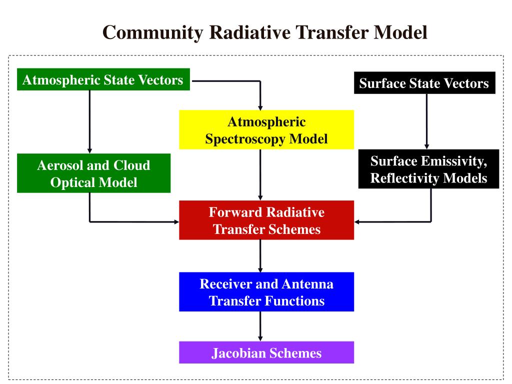 Community Radiative Transfer Model Atmospheric State Vectors Surface State Vectors Atmospheric Spectroscopy Model Surface Emissivity, Reflectivity Models Aerosol and Cloud Optical Model Forward Radiative Transfer Schemes Receiver and Antenna Transfer Functions Jacobian Schemes