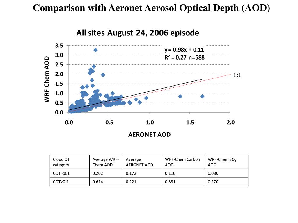 Comparison with Aeronet Aerosol Optical Depth (AOD) 1:1 Overestimate in WRF-CHem AOD occurs when clouds (and enhanced sulfate production) are simulated but not observed