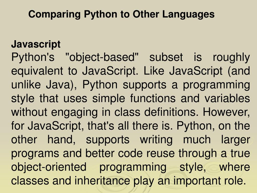 Comparing Python to Other Languages Javascript Python's "object-based" subset is roughly equivalent to JavaScript. Like JavaScript (and unlike Java), Python supports a programming style that uses simple functions and variables without engaging in class definitions. However, for JavaScript, that's all there is. Python, on the other hand, supports writing much larger programs and better code reuse through a true object-oriented programming style, where classes and inheritance play an important role.