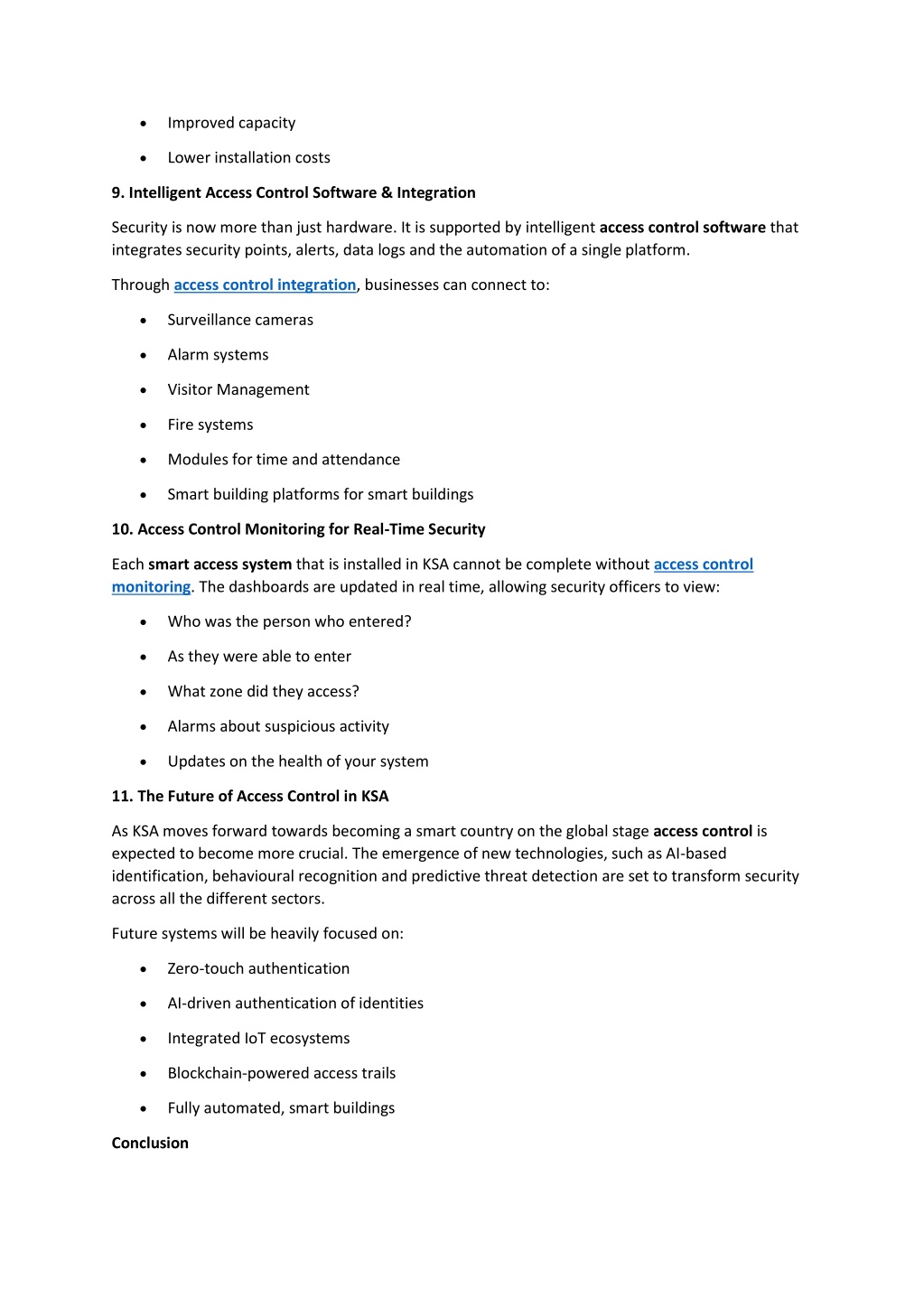 • Improved capacity • Lower installation costs 9. Intelligent Access Control Software & Integration Security is now more than just hardware. It is supported by intelligent access control software that integrates security points, alerts, data logs and the automation of a single platform. Through access control integration, businesses can connect to: • Surveillance cameras • Alarm systems • Visitor Management • Fire systems • Modules for time and attendance • Smart building platforms for smart buildings 10. Access Control Monitoring for Real-Time Security Each smart access system that is installed in KSA cannot be complete without access control monitoring. The dashboards are updated in real time, allowing security officers to view: • Who was the person who entered? • As they were able to enter • What zone did they access? • Alarms about suspicious activity • Updates on the health of your system 11. The Future of Access Control in KSA As KSA moves forward towards becoming a smart country on the global stage access control is expected to become more crucial. The emergence of new technologies, such as AI-based identification, behavioural recognition and predictive threat detection are set to transform security across all the different sectors. Future systems will be heavily focused on: • Zero-touch authentication • AI-driven authentication of identities • Integrated IoT ecosystems • Blockchain-powered access trails • Fully automated, smart buildings Conclusion