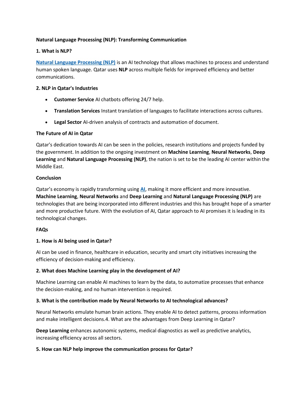 Natural Language Processing (NLP): Transforming Communication 1. What is NLP? Natural Language Processing (NLP) is an AI technology that allows machines to process and understand human spoken language. Qatar uses NLP across multiple fields for improved efficiency and better communications. 2. NLP in Qatar's Industries • Customer Service AI chatbots offering 24/7 help. • Translation Services Instant translation of languages to facilitate interactions across cultures. • Legal Sector AI-driven analysis of contracts and automation of document. The Future of AI in Qatar Qatar's dedication towards AI can be seen in the policies, research institutions and projects funded by the government. In addition to the ongoing investment on Machine Learning, Neural Networks, Deep Learning and Natural Language Processing (NLP), the nation is set to be the leading AI center within the Middle East. Conclusion Qatar’s economy is rapidly transforming using AI, making it more efficient and more innovative. Machine Learning, Neural Networks and Deep Learning and Natural Language Processing (NLP) are technologies that are being incorporated into different industries and this has brought hope of a smarter and more productive future. With the evolution of AI, Qatar approach to AI promises it is leading in its technological changes. FAQs 1. How is AI being used in Qatar? AI can be used in finance, healthcare in education, security and smart city initiatives increasing the efficiency of decision-making and efficiency. 2. What does Machine Learning play in the development of AI? Machine Learning can enable AI machines to learn by the data, to automatize processes that enhance the decision-making, and no human intervention is required. 3. What is the contribution made by Neural Networks to AI technological advances? Neural Networks emulate human brain actions. They enable AI to detect patterns, process information and make intelligent decisions.4. What are the advantages from Deep Learning in Qatar? Deep Learning enhances autonomic systems, medical diagnostics as well as predictive analytics, increasing efficiency across all sectors. 5. How can NLP help improve the communication process for Qatar?
