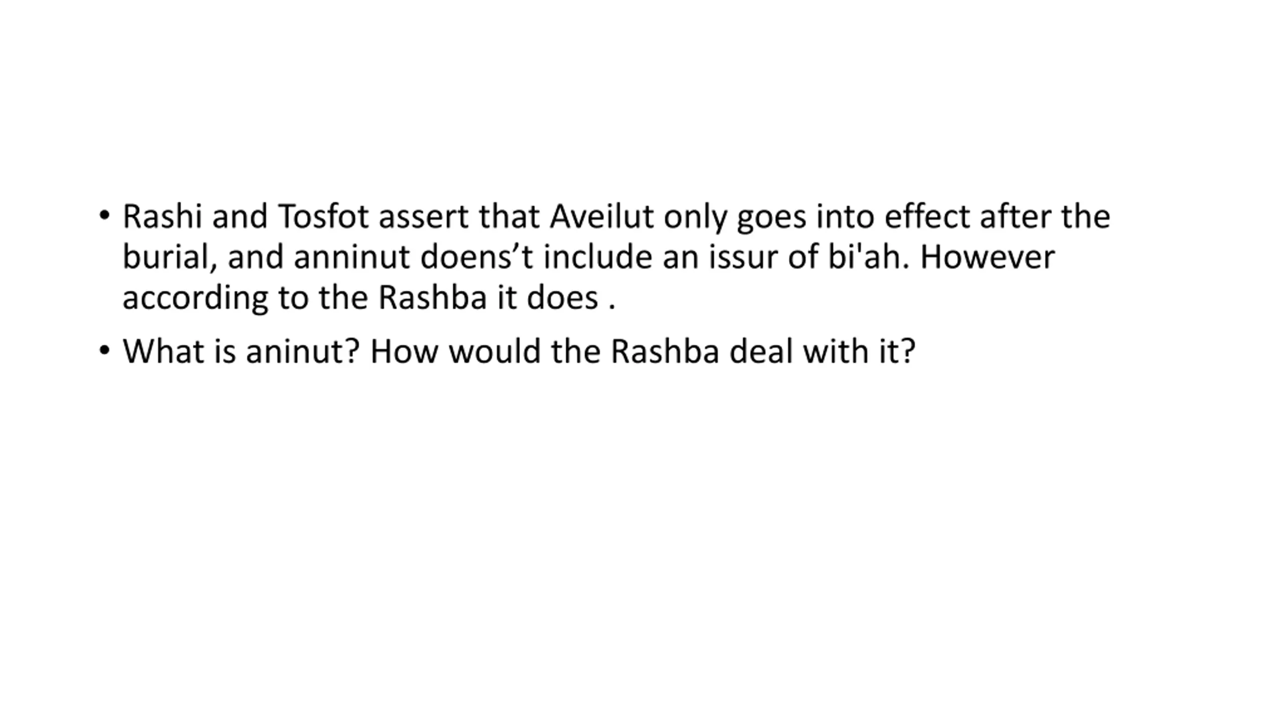 • Rashi and Tosfot assert that Aveilut only goes into effect after the burial, and anninut doens’t include an issur of bi'ah. However according to the Rashba it does . • What is aninut? How would the Rashba deal with it?