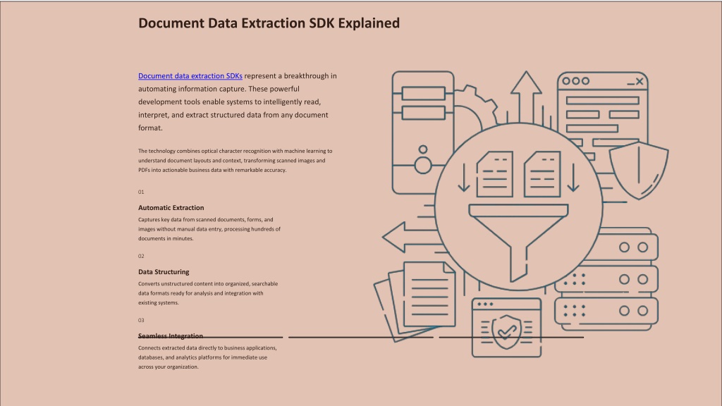9. FUTURE TRENDS Future Trends in Document Management The evolution of document management technology continues to accelerate, driven by advances in artificial intelligence, machine learning, and integration capabilities. Organizations that embrace these emerging trends position themselves for sustained competitive advantage. Intelligent Automation 1 AI-driven automation expands beyond simple tasks to complex decision-making, with systems learning organizational patterns and proactively optimizing document workflows. Advanced SDK Capabilities 2 Next-generation data extraction SDKs deliver deeper insights through enhanced context understanding, multi-language support, and real-time processing of complex documents. Unified Integration 3 Seamless workflow integrations across platforms become standard, with APIs and connectors enabling frictionless data flow between document systems and business applications.