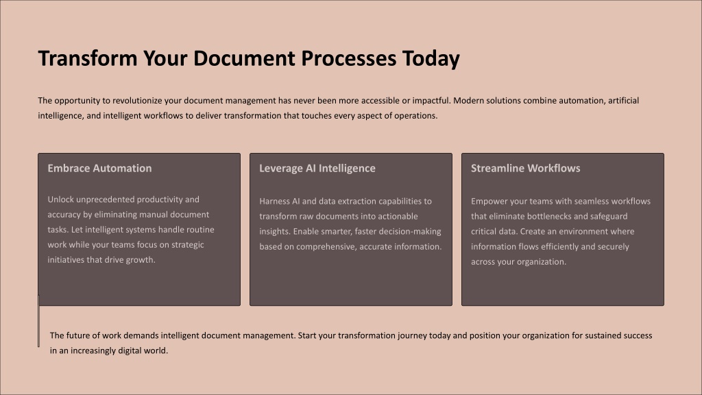 10. Transform Your Document Processes Today The opportunity to revolutionize your document management has never been more accessible or impactful. Modern solutions combine automation, artificial intelligence, and intelligent workflows to deliver transformation that touches every aspect of operations. Embrace Automation Leverage AI Intelligence Streamline Workflows Unlock unprecedented productivity and accuracy by eliminating manual document tasks. Let intelligent systems handle routine work while your teams focus on strategic initiatives that drive growth. Harness AI and data extraction capabilities to transform raw documents into actionable insights. Enable smarter, faster decision-making based on comprehensive, accurate information. Empower your teams with seamless workflows that eliminate bottlenecks and safeguard critical data. Create an environment where information flows efficiently and securely across your organization. The future of work demands intelligent document management. Start your transformation journey today and position your organization for sustained success in an increasingly digital world.
