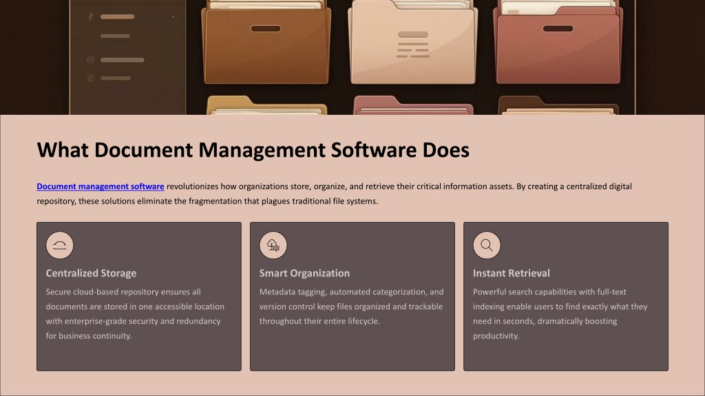 3. What Document Management Software Does Document management software revolutionizes how organizations store, organize, and retrieve their critical information assets. By creating a centralized digital repository, these solutions eliminate the fragmentation that plagues traditional file systems. Centralized Storage Smart Organization Instant Retrieval Secure cloud-based repository ensures all documents are stored in one accessible location with enterprise-grade security and redundancy for business continuity. Metadata tagging, automated categorization, and version control keep files organized and trackable throughout their entire lifecycle. Powerful search capabilities with full-text indexing enable users to find exactly what they need in seconds, dramatically boosting productivity.