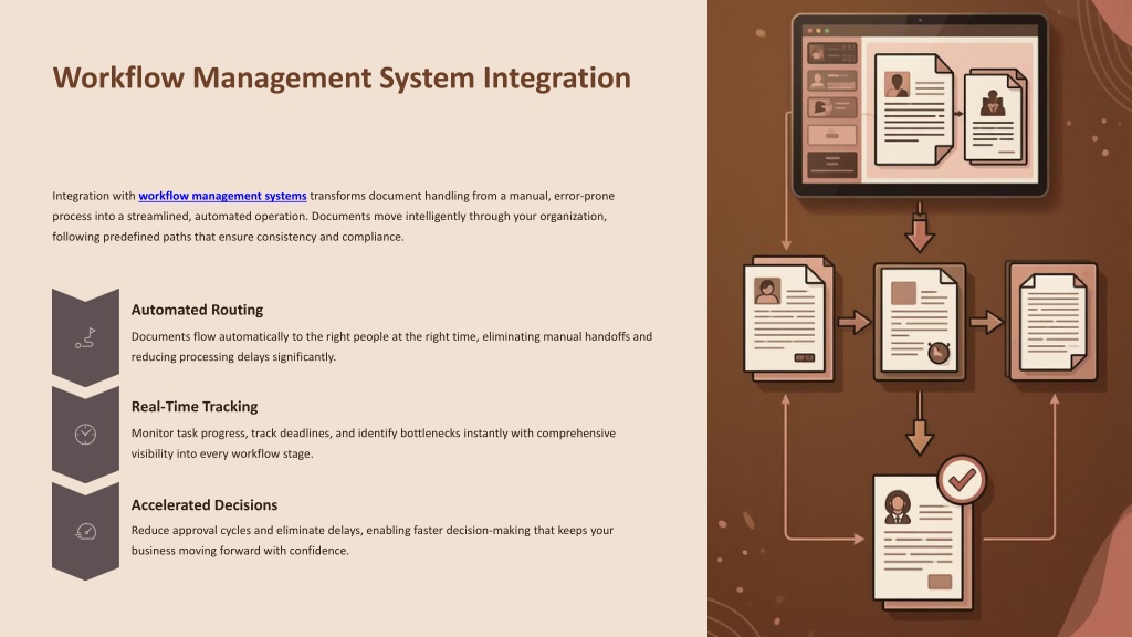4. Workflow Management System Integration Integration with workflow management systems transforms document handling from a manual, error-prone process into a streamlined, automated operation. Documents move intelligently through your organization, following predefined paths that ensure consistency and compliance. Automated Routing Documents flow automatically to the right people at the right time, eliminating manual handoffs and reducing processing delays significantly. Real-Time Tracking Monitor task progress, track deadlines, and identify bottlenecks instantly with comprehensive visibility into every workflow stage. Accelerated Decisions Reduce approval cycles and eliminate delays, enabling faster decision-making that keeps your business moving forward with confidence.