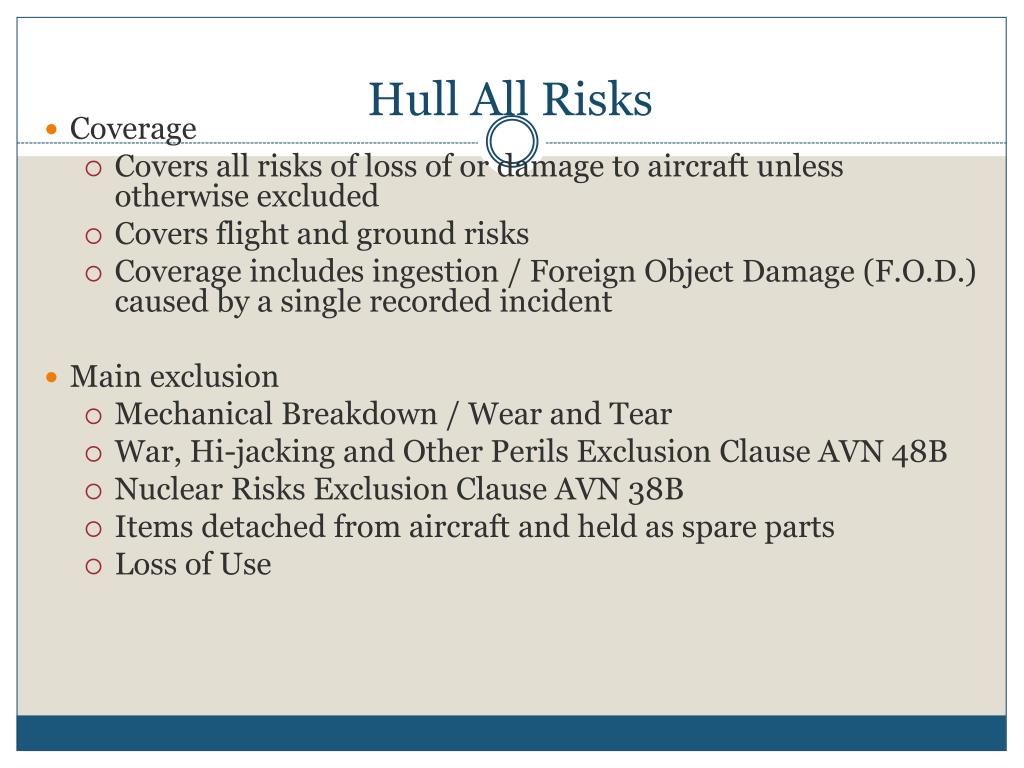 Hull All Risks • Coverage • Covers all risks of loss of or damage to aircraft unless otherwise excluded • Covers flight and ground risks • Coverage includes ingestion / Foreign Object Damage (F.O.D.) caused by a single recorded incident • Main exclusion • Mechanical Breakdown / Wear and Tear • War, Hi-jacking and Other Perils Exclusion Clause AVN 48B • Nuclear Risks Exclusion Clause AVN 38B • Items detached from aircraft and held as spare parts • Loss of Use