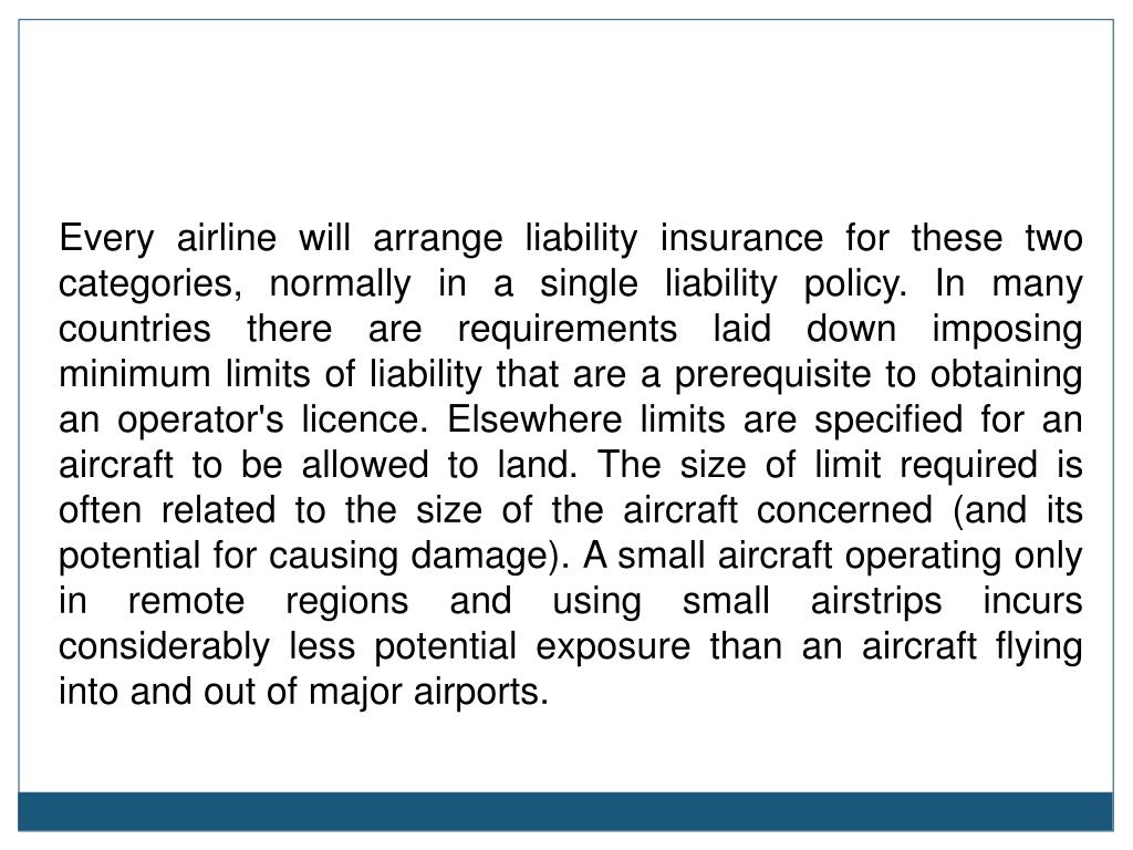 Every airline will arrange liability insurance for these two categories, normally in a single liability policy. In many countries there are requirements laid down imposing minimum limits of liability that are a prerequisite to obtaining an operator's licence. Elsewhere limits are specified for an aircraft to be allowed to land. The size of limit required is often related to the size of the aircraft concerned (and its potential for causing damage). A small aircraft operating only in remote regions and using small airstrips incurs considerably less potential exposure than an aircraft flying into and out of major airports.